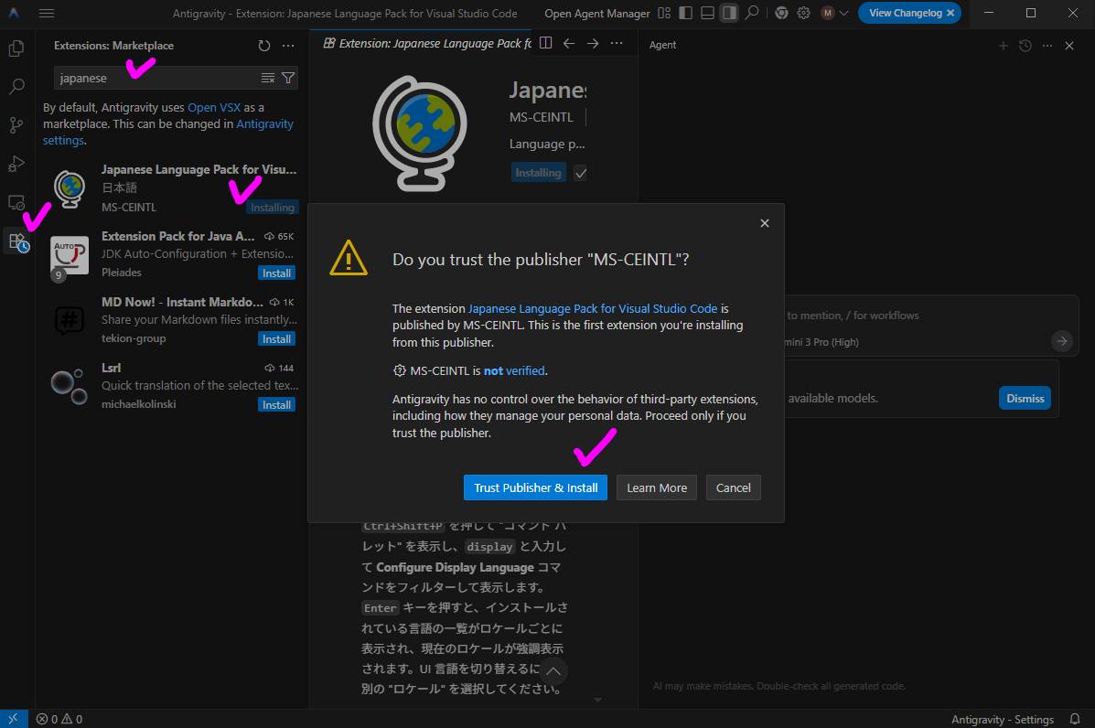 ↑とりあえず、日本語のプラグインを導入。(結局、英語表示されるので、無くても良い。)