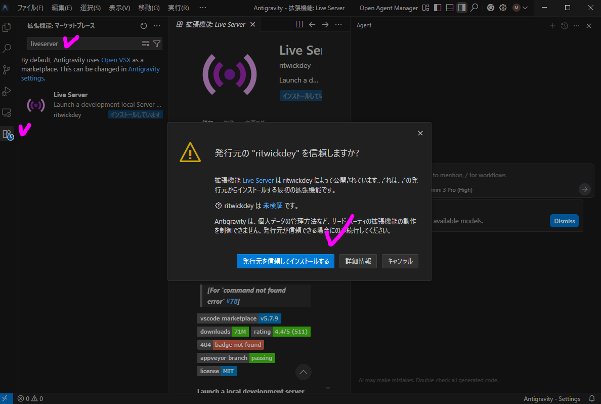 ↑生成したコーディングの結果を確認するために、liveserverを導入する。