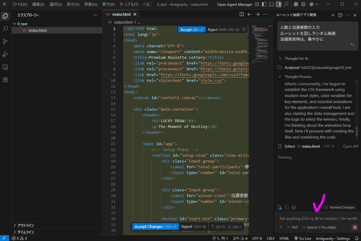 ↑とりあえず、抽選ルーレットを作るように指示すると、数十秒で、コーディングが完成。