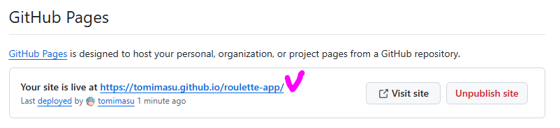 ↑Settings → Pages →Branchはmain → Saveで、新規にページ(URL)が公開された。