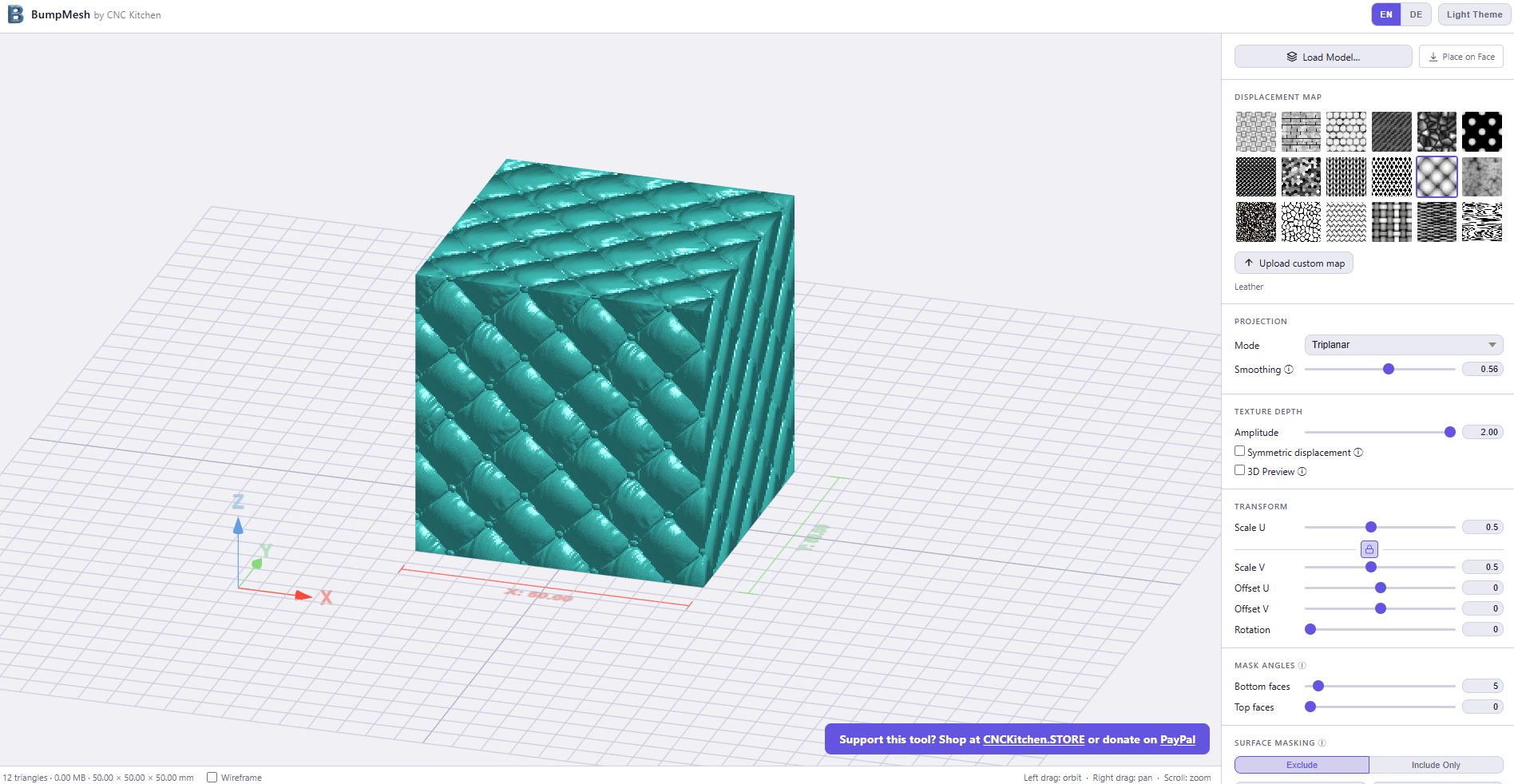 License & Terms Free to use for any purpose, including commercial work (e.g., texturing STLs for clients or products). Attribution is appreciated but not required when using this tool as-is. This tool is provided as-is with no warranty of any kind. Use at your own risk. No support is provided. The author is under no obligation to fix bugs, answer questions, or update this tool. That said, bug reports and feature requests are always welcome at texturizer@cnckitchen.com. The author shall not be held liable for any damages, data loss, or issues arising from the use of this tool. Support this tool? Shop at CNCKitchen.STORE or donate on PayPal.