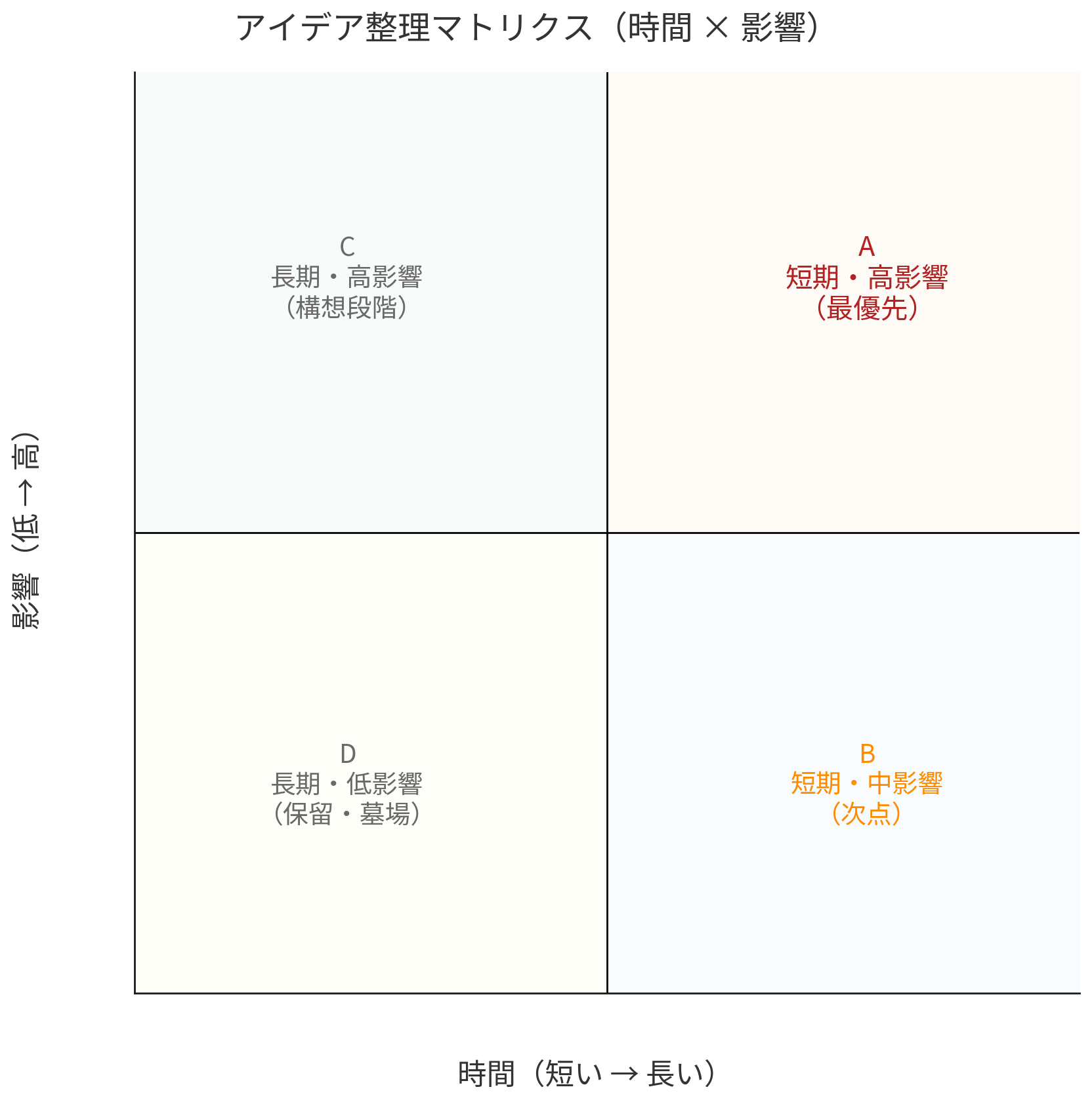 - 右下(B)短期×低影響 → 次点、余力があれば実行
