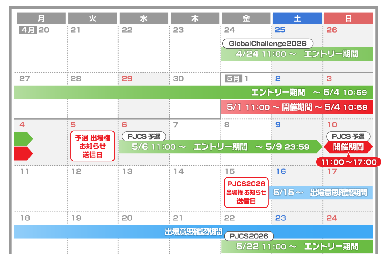 - PJCS2026予選 5月10日開催 グローバルチャレンジ通過者のみ参加可能 各カテゴリ上位128名が本戦へ